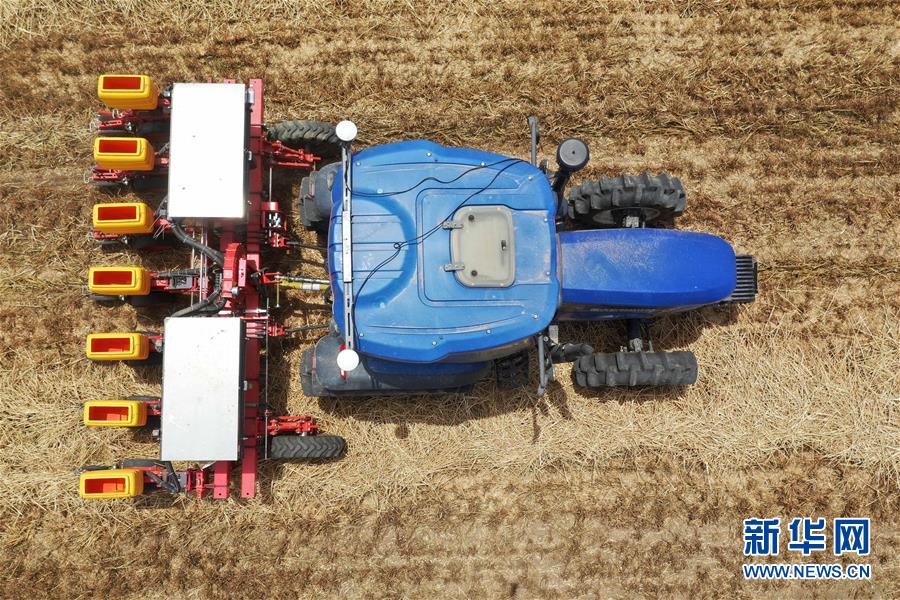 在河南省鄧州市小楊營鎮安眾村,加裝有北斗導航系統的拖拉機在無人駕駛狀態下播種(2020年5月26日攝,無人機照片)。 新華社記者 馮大鵬 攝