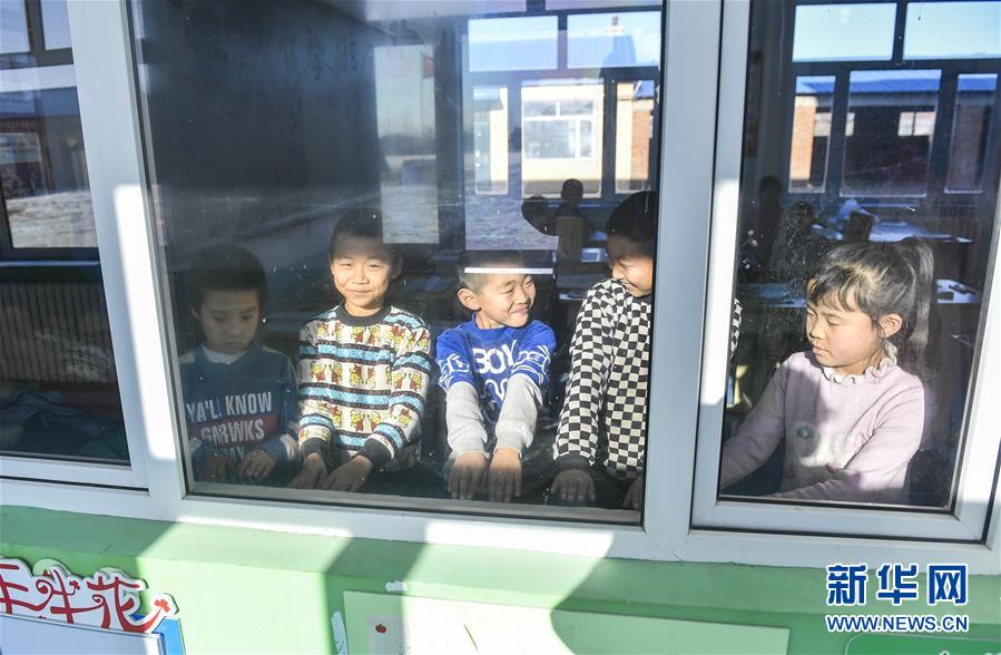 吉林省德惠市邊崗鄉臥虎村小學學生在戶外活動后圍著教室內的環流散熱器取暖(2018年12月26日攝)。? 新華社記者 許暢 攝