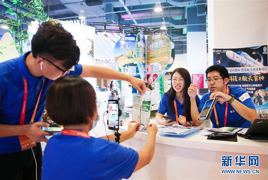 在2020年中國國際服務貿易交易會旅游服務專題展區,中國旅游集團展位的工作人員通過直播向線上觀眾介紹旅游服務產品(2020年9月5日攝)。?新華社記者 潘思危 攝