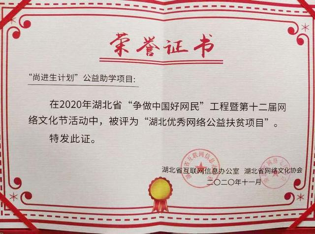 首頁 >> 專題報道 >> 2020專題 >> 網(wǎng)絡(luò)公益扶貧聯(lián)盟 >> 最新報道 >> 正文中新網(wǎng)11月26日電 11月25日,2020年湖北省“爭做中國好網(wǎng)民”工程暨第十二屆網(wǎng)絡(luò)文化節(jié)成果展示活動舉行。2020年湖北省“爭做中國好網(wǎng)民”工程評選揭曉,尚德機構(gòu)“尚進(jìn)生計劃”公益助學(xué)項目被評為“湖北優(yōu)秀網(wǎng)絡(luò)公益扶貧項目”。