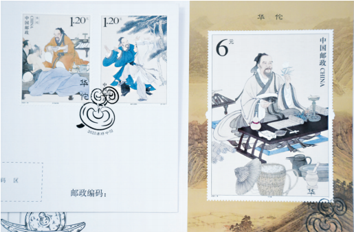 《華佗》特種郵票在漢首發(fā)。郵票設(shè)計人員將華佗的兩大醫(yī)學(xué)貢獻“發(fā)明麻沸散”“編創(chuàng)五禽戲”設(shè)計為郵票畫面,并與一枚“華佗...