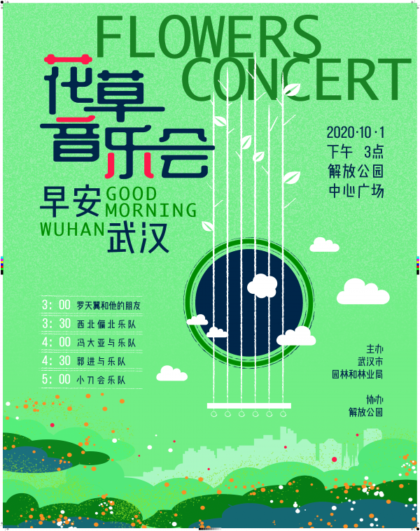 拉開“公園文化季”帷幕的是10月1日在解放公園嘉卉廣場舉辦的花草音樂會,這是由藝術家自發奉獻、跨界合作、公益參與的原創音樂會。五個樂隊將攜最新單曲參與音樂會。這些新曲,全部創作于疫情防控期間的武漢。這些音樂人中,有從大理來武漢的馮大亞,也有從伊犁來武漢的胡安什,還有武漢音樂人郭進。他們熱愛武漢,也希望通過自己的音樂展現疫情中武漢的頑強和疫情后武漢的復蘇。