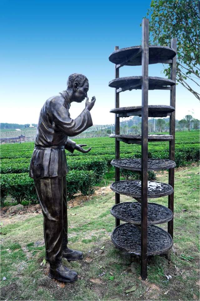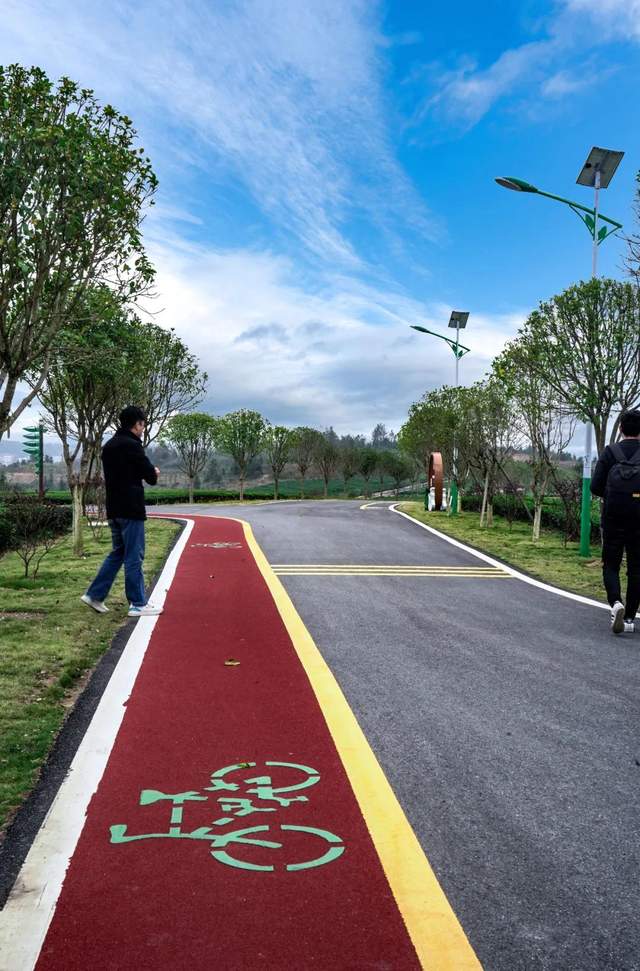 瀝青公路上鋪設了一條彩色騎行跑道,路邊每隔一段距離,立有采茶元素的雕塑,非常適合打卡拍照,站在交錯的茶梗里,不管低頭采茶還是抬頭招手,都是一部大片。