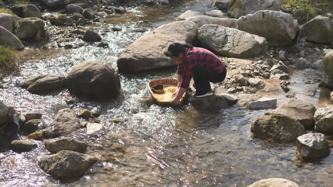 麥?zhǔn)懈勺拥闹谱鲝霓r(nóng)家婦人篩選和浸泡黃豆開(kāi)始,數(shù)小時(shí)后,浸泡好的黃豆被撈起,在溪流中淘洗,其景可以入畫(huà)。