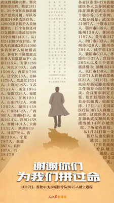 在一張紀念這一刻的海報上,一個白大褂的背影,安靜地走出“湖北”地圖。兩側打開的“大門”,布滿了各省馳援醫護人員的密密麻麻的數字。一行大字,成為逆行者剛剛跨越的那道“門坎”:謝謝你們,為我們拼過命。