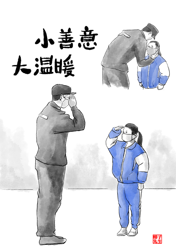 每一個(gè)善舉,都會(huì)帶來(lái)溫暖和感動(dòng)。每一份善意,都能轉(zhuǎn)化為幸福和力量。為暖心的民警和有禮貌的小女孩點(diǎn)贊,也再次提醒大家,疫情還沒(méi)過(guò)去,切勿掉以輕心?。ㄎ模憾?手繪:趙凱)