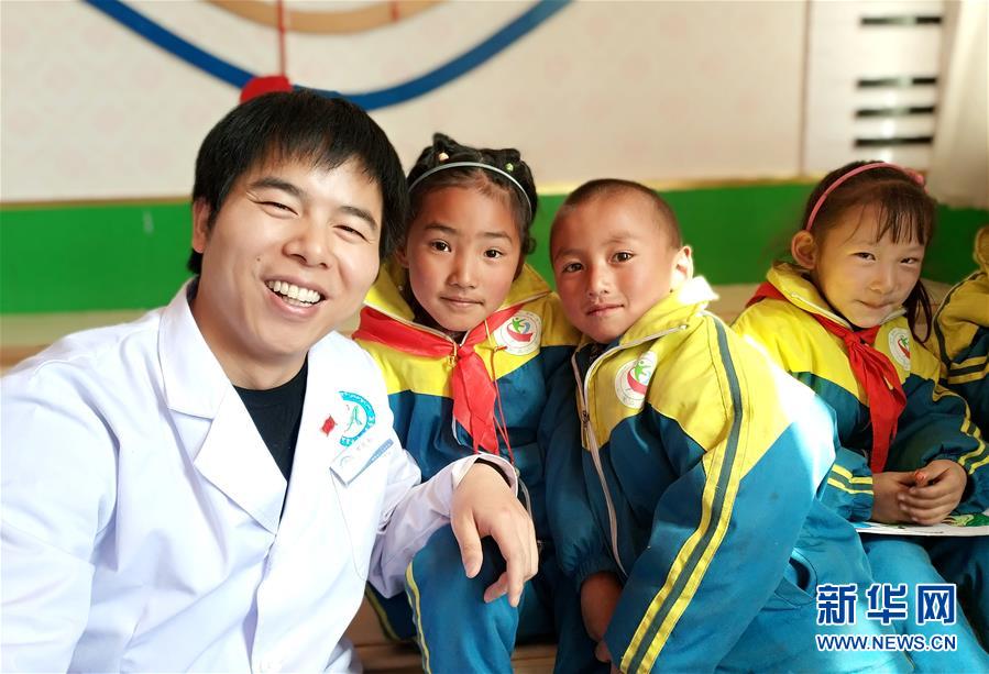 羅花南(左一)和西藏阿里孔繁森小學的學生們在一起(2019年3月20日攝,手機照片)。新華社發