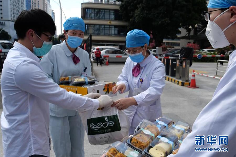 郭屹凡(左一)向福建省立醫院醫務人員贈送咖啡及面包點心(視頻截圖)。新華社發