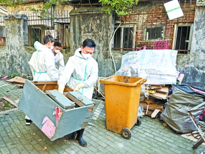 3月下旬,下沉黨員發現一處堆積如山的雜物囤積點。囤積點需消殺,且堆放雜亂存在安全隱患,下沉黨員們決定清除這個隱患,社區也迅速調來一輛環衛車。何旭兵、吳曉、楊國志、湯鵬、梅磊、余后梁等6名黨員干部一齊動手,用了一整天時間,共清運出4車雜物,終于夷平這座“荒貨”山,并將現場徹底消毒。