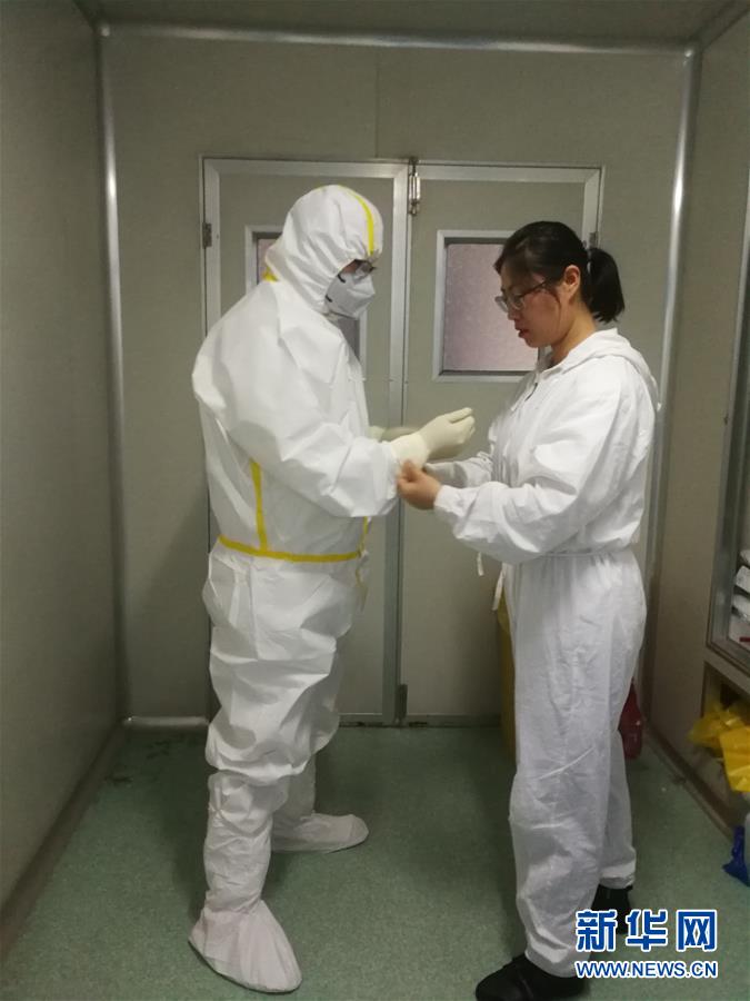 4月23日,在山西省朔州市疾病預防控制中心,李娟在幫助曹梁穿戴防護設備。新華社發