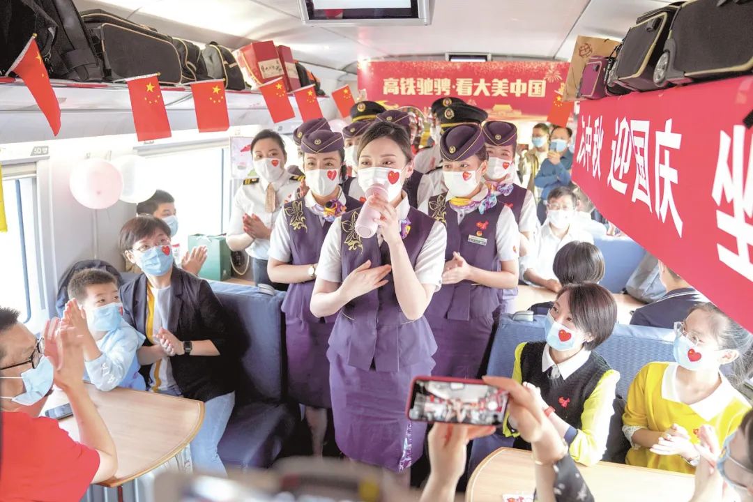 十月一日上午九時(shí),G1773次高鐵上的乘務(wù)員們?yōu)榧磳⒅鼗匚錆h的江蘇援鄂醫(yī)療隊(duì)員及其家屬們獻(xiàn)歌《我和我的祖國(guó)》。( 陳少哲 攝)