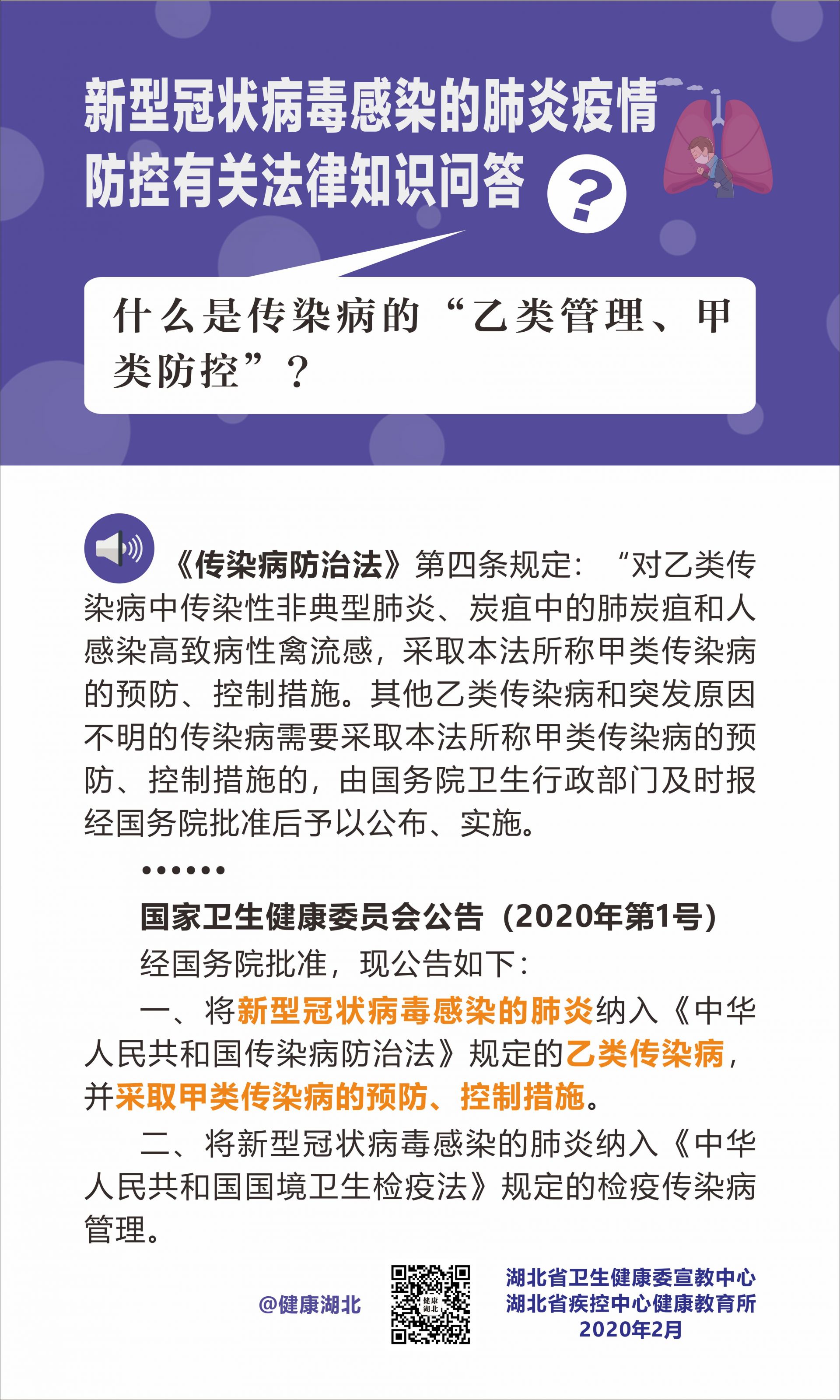 《中華人民共和國國家衛(wèi)生健康委員會公告》(2020年第1號)規(guī)定:經(jīng)國務(wù)院批準(zhǔn),將新型冠狀病毒感染的肺炎納入《中華人民共和國國境衛(wèi)生檢疫法》規(guī)定的檢疫傳染病管理。