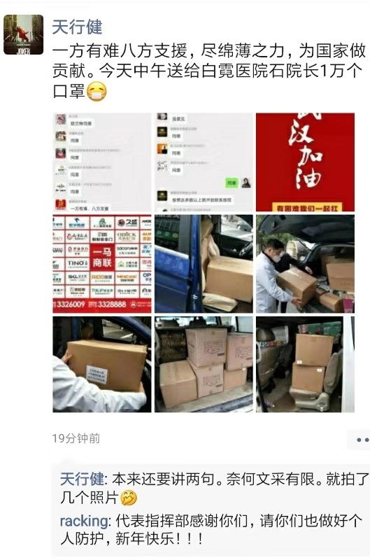 為保障疫情防控需要,中健醫療用品有限公司迅速復工,開足馬力、加班生產醫用口罩;一馬建材城商戶們自發組織,購買口罩10000個,緊急送往第二人民醫院;愛心企業家徐椿森向崇陽縣紅十字會捐款100000元……