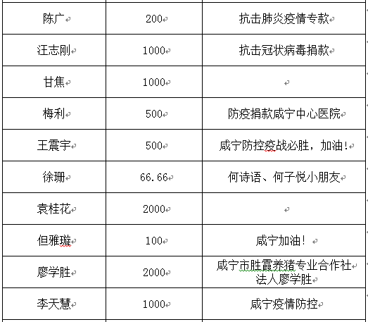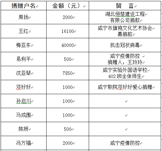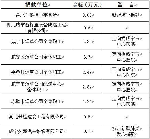 市紅十字會接收捐贈款物由咸寧市新型冠狀病毒感染的肺炎防控指揮部統(tǒng)一調(diào)配使用。咸寧市紅十字會將依法依規(guī)公布捐贈接收和使用情況,接受社會監(jiān)督。現(xiàn)將捐贈情況公示如下。(后續(xù)捐贈情況會持續(xù)予以公布,敬請關(guān)注)