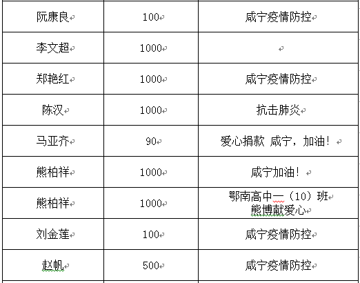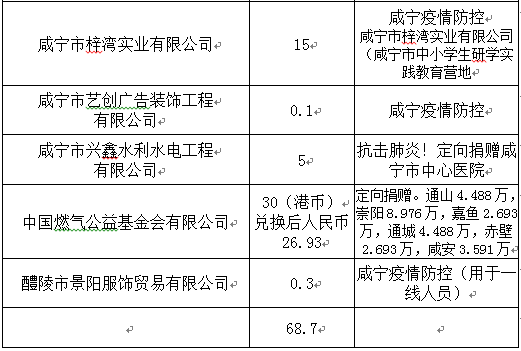 捐贈人:云南省彌勒市市委老干局咸寧市一航科技有限公司0.2咸寧疫情防控德宏州紅十字會3.93991德宏師范高等專科學(xué)校定向湖北...