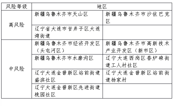 全國中、高風險等級地區分布情況表風險等級地區高風險新疆烏魯木齊市天山區新疆烏魯木齊市沙依巴克區遼寧省大連市甘井子區大...