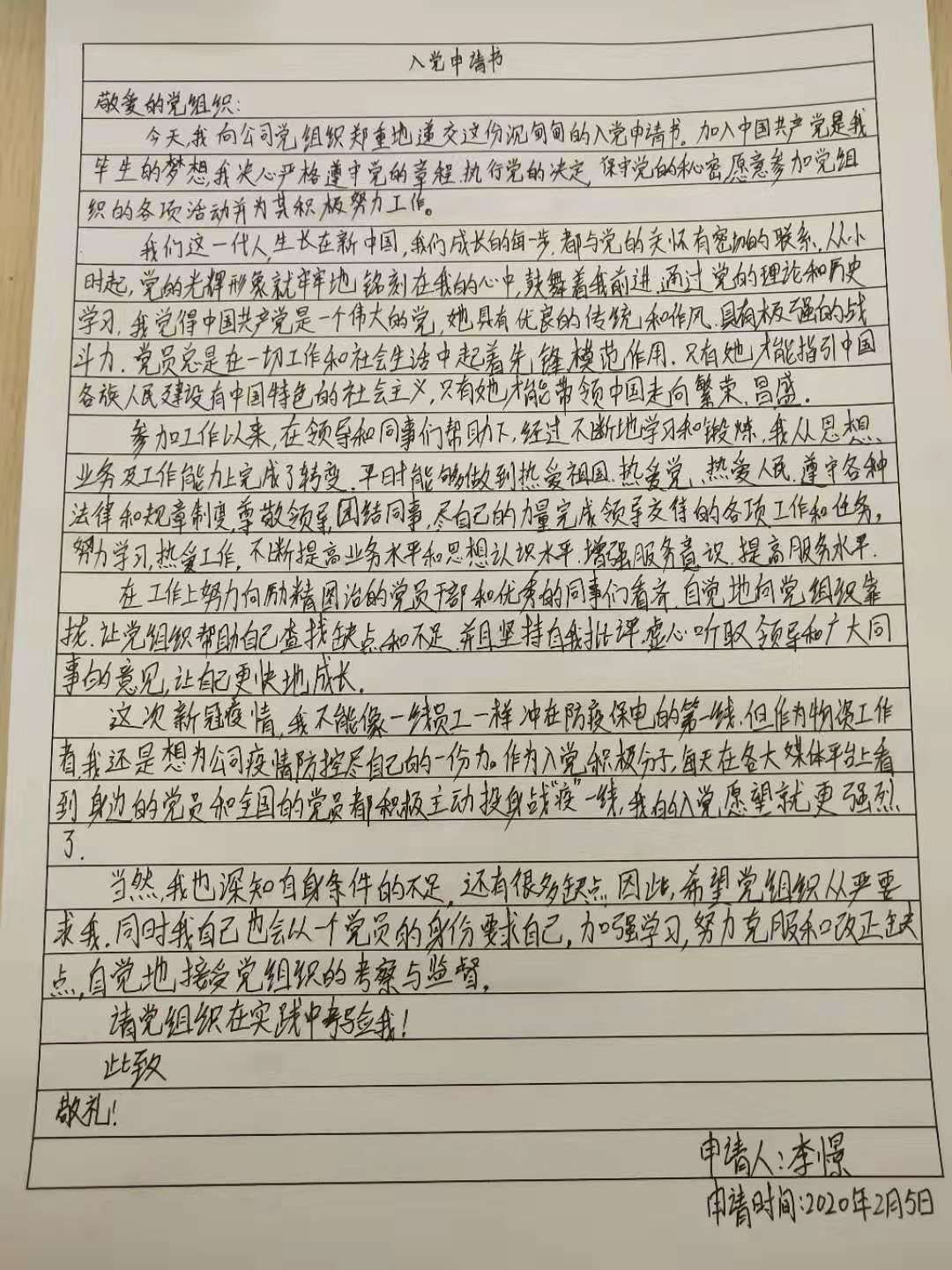 晚上在家,李憬利用休息時間,寫下了入黨申請書?!拔抑驹讣尤胫袊伯a黨,擁護黨的綱領,遵守黨的章程,履行黨員義務,全身心地投入到防疫阻擊戰中,直至勝利!”李憬一邊寫一邊想著。