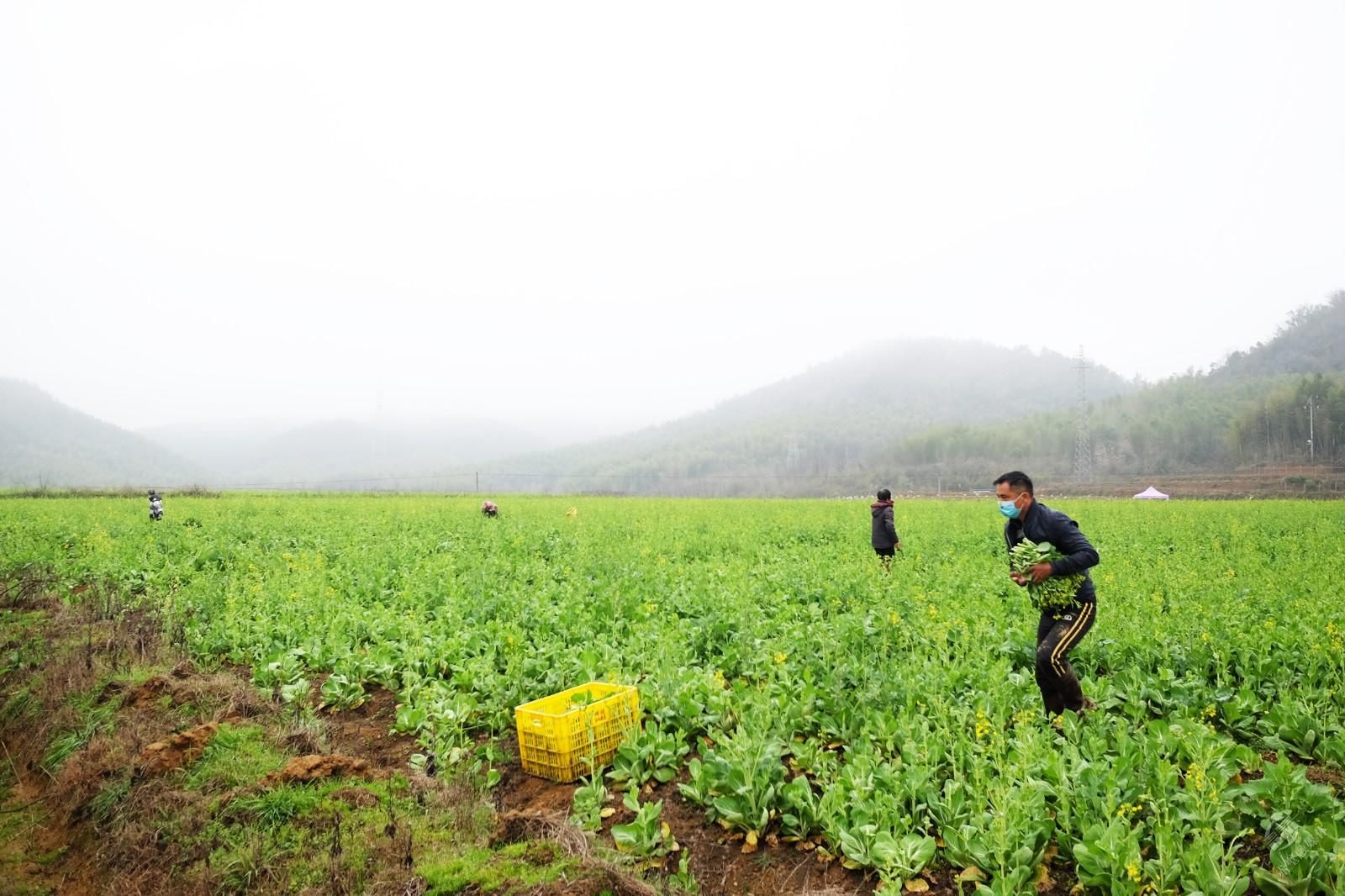 “特殊時期,大家相互幫忙也是應(yīng)該的,每天早上七點半就來幫忙采收,中午回家吃完飯就來,工錢無所謂,只要他能減少損失。”正在地里采收菜薹的黃沙村62歲村民熊國泰說,得知余俊義缺乏采收人手,26日他就過來幫忙采收第一批菜薹,附近陸續(xù)十余名村民通過申請也過來幫忙了,大家都戴著口罩分散在75畝地里采收。