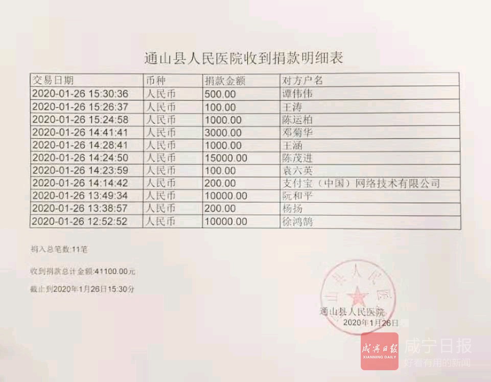 26日,記者從通山縣人民醫(yī)院獲悉,當(dāng)日該院接受首批社會(huì)捐款56000元。