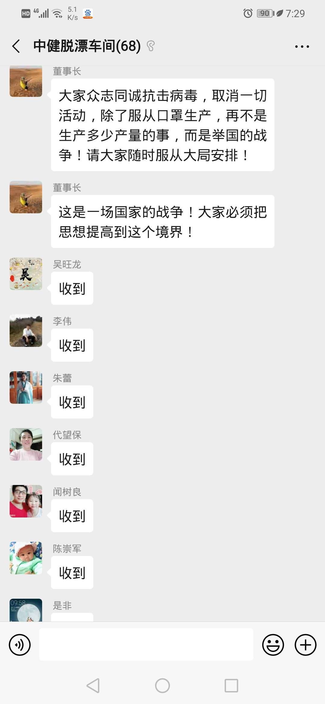 “大家眾志同城抗擊病毒,取消一切活動,除了服從口罩生產!再不是生產多少產量的事,而是舉國的戰(zhàn)爭,請大家隨時服從大局安排!”在微信群里,汪定邦耐心地跟員工們解釋。