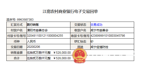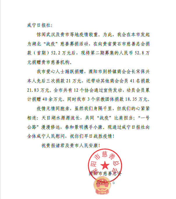 看到湖北省疫情嚴重,溧陽市慈善總會首期將52.2萬元捐贈給了黃石市。近期又募集到52.8萬元,得知咸寧疫情形勢緊張,決定通過咸寧日報向咸寧慈善會捐款52.8萬元。