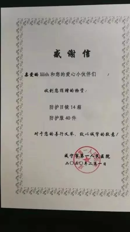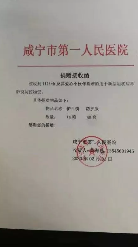 1月25日,宏業(yè)公司干部李麗詩同志看到疫情嚴(yán)重的醫(yī)院借助網(wǎng)絡(luò)平臺發(fā)起所需物資請求,了解到咸寧市醫(yī)護(hù)人員救治所需物資極度缺乏。她帶頭捐贈并借助微信平臺發(fā)起請求,帶動身邊的同事以及朋友共同募集資金六萬元,并緊急尋找到購買物資渠道,購買了17箱護(hù)目鏡分別送到咸寧市人民醫(yī)院和崇陽縣人民醫(yī)院。