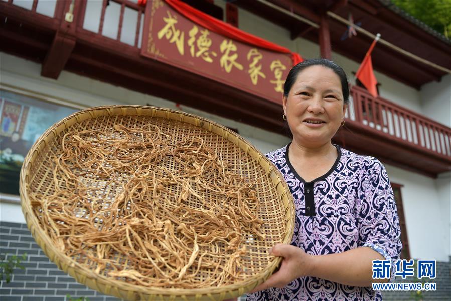 神山村村民彭夏英在自己開的農(nóng)家樂前展示自家的農(nóng)產(chǎn)品(7月15日攝)。新華社記者 彭昭之 攝