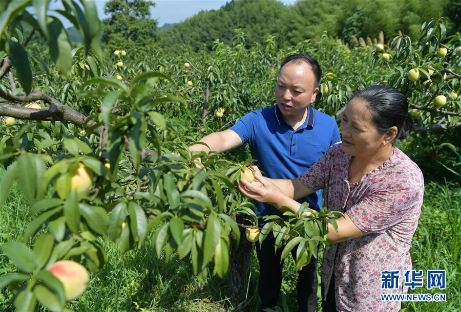 神山村村民彭夏英(右)在自家的黃桃果園內(nèi)查看黃桃生長情況(7月16日攝)。新華社記者 彭昭之 攝