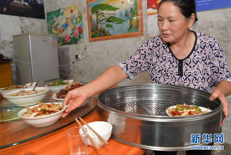 神山村村民彭夏英在自己開的農(nóng)家樂給游客上菜(7月15日攝)。新華社記者 彭昭之 攝
