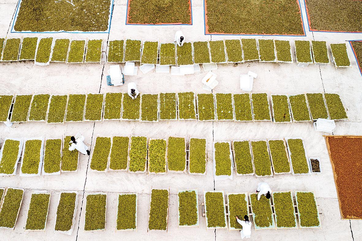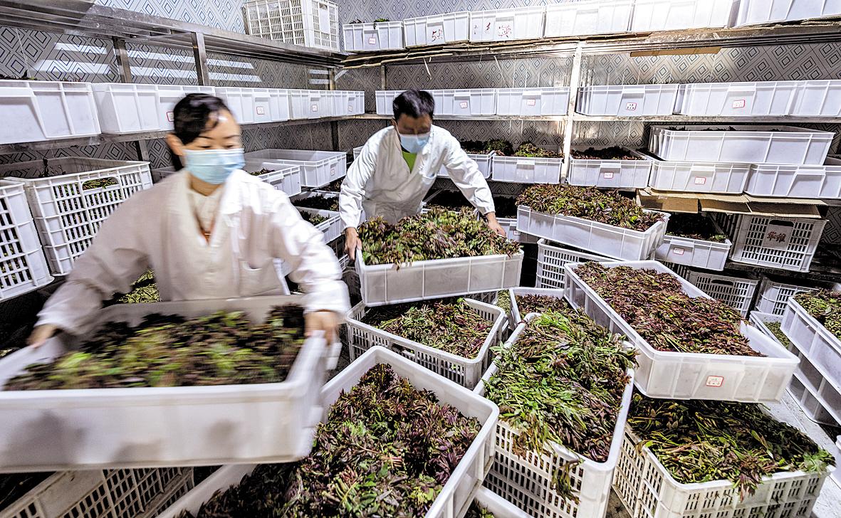 社員們在晾曬干香椿芽。