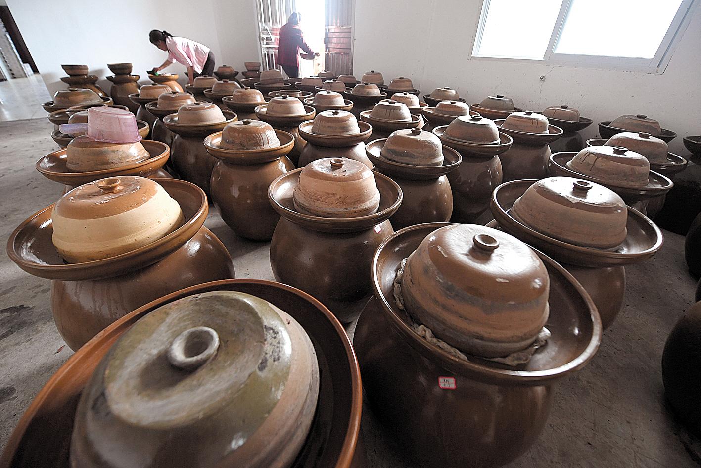 工人在查看香椿醬菜腌制情況。