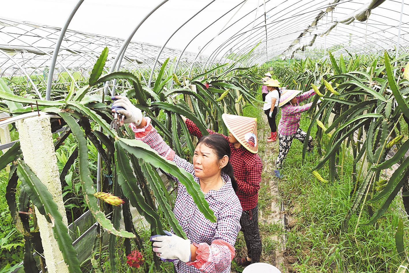 7月中旬以來,黃梅縣五祖鎮劉岳村貧困戶在五祖福果園修剪火龍果。湖北大唐慧農生態科技有限公司2016年在這里流轉土地260畝,建成生態農業園。公司依托果園開展產業扶貧,以土地流轉和提供用工崗位的方式幫助農民脫貧致富。