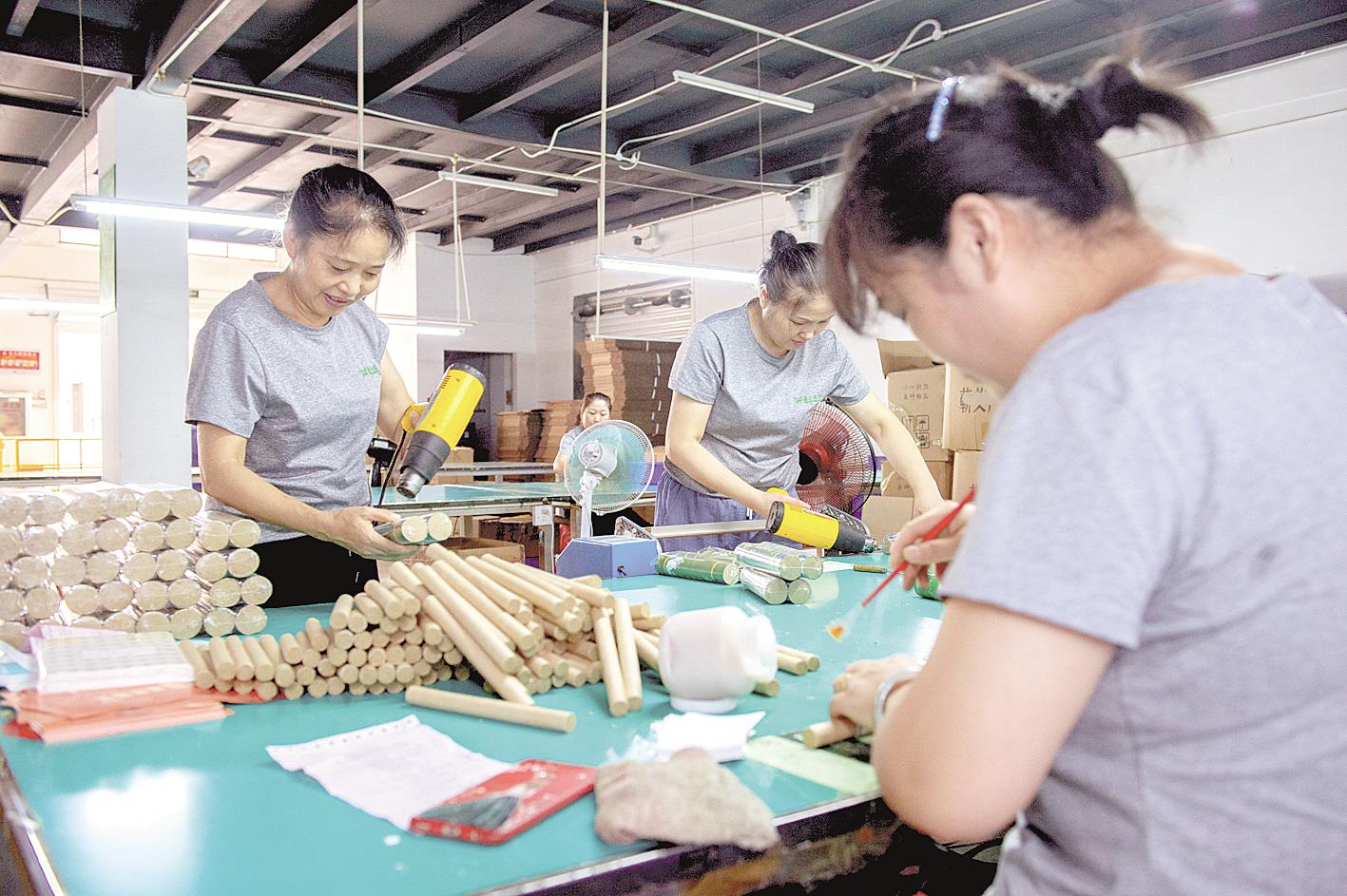 8月25日,位于蘄春縣的湖北鼎艾科技股份有限公司生產車間,工作人員正在制作艾條。