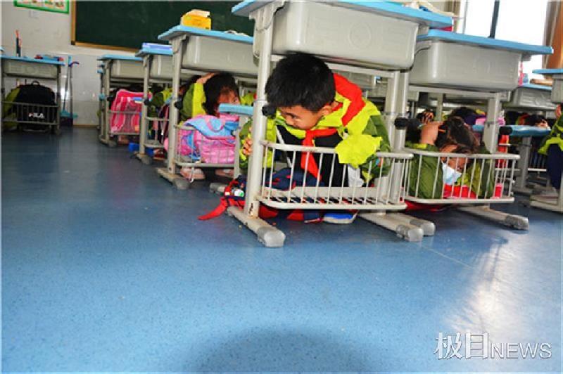 在學(xué)校,演練通過模擬學(xué)校上課期間發(fā)生地震和宿舍樓寢室起火,有人員被困;隨后,學(xué)校立即啟動應(yīng)急預(yù)案,教室里同學(xué)們立即按照要求躲避到課桌下自救,在確定情況穩(wěn)定后,在老師的組織下疏散逃生,三分鐘內(nèi),教室里的同學(xué)們?nèi)堪踩冯x到操場。通過防震防火疏散演練,消防安全知識展示、安全知識講解的方式,向?qū)W生普及避險自救知識和技能,并與學(xué)生進(jìn)行防災(zāi)減災(zāi)知識互動。