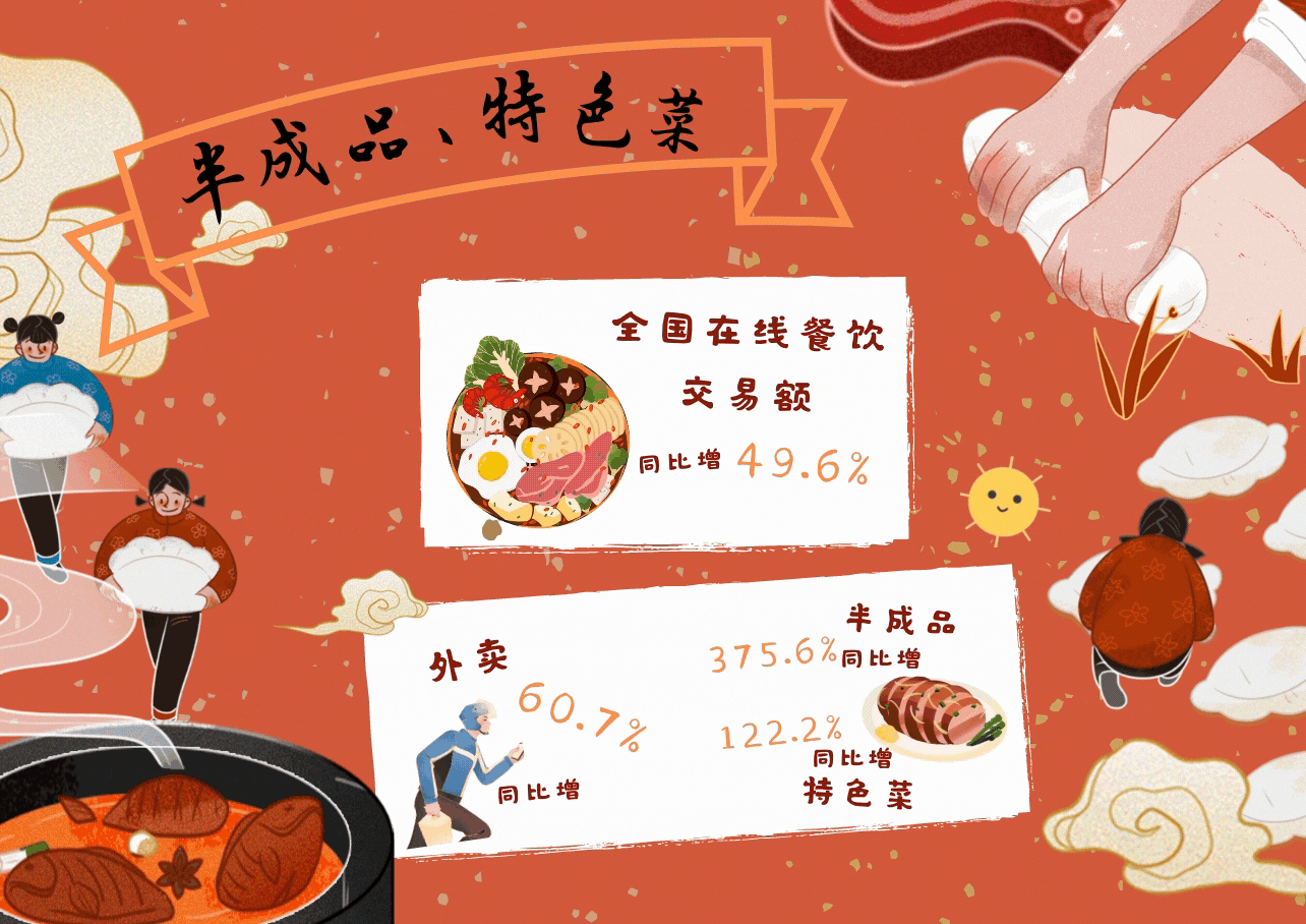 據商務部最新數據顯示,年貨節期間,全國在線餐飲交易額同比增長49.6%,外賣同比增長60.7%,半成品、特色年菜同比分別增長375.6%和122.2%。同期,中西部地區網絡零售額同比增速較快,廣西、江西分別增長35.9%和22.5%。