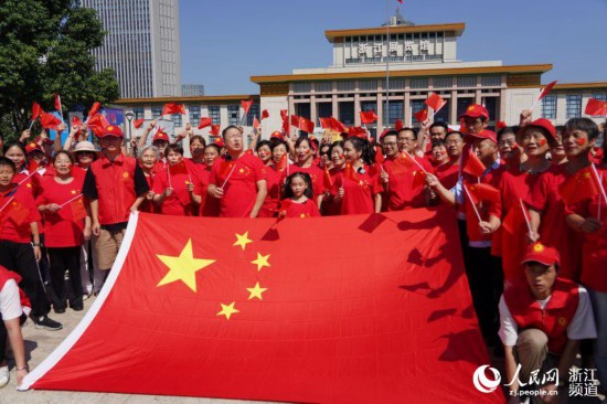 人民網杭州10月1日電 (張麗瑋)今天上午10時許,一場迎國慶紅韻快閃活動在杭州市武林廣場舉行。伴隨著《我和我的祖國》《歌唱祖國》的悠揚曲調,人們心潮澎湃,紛紛舉起手中的小紅旗,百余人一起唱響歌曲,獻禮祖國。