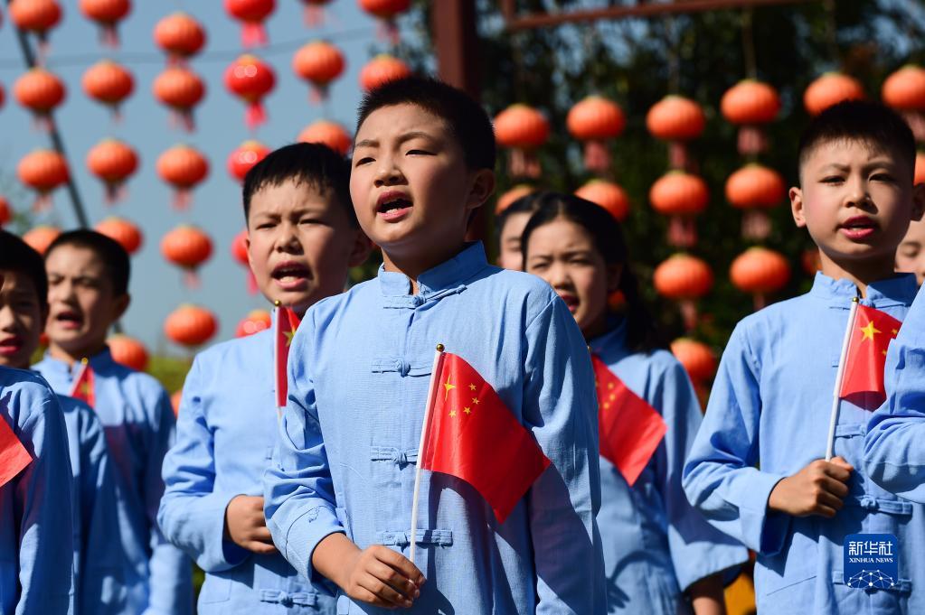 10月1日,在合肥濱湖國家森林公園,合肥市奧體小學的學生們在朗誦《少年中國說》節選。