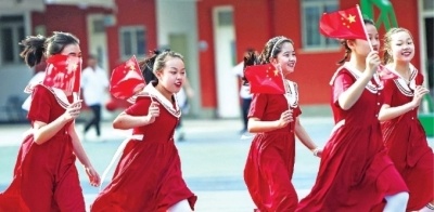 武漢六中上智中學學生揮動小國旗,快樂奔跑。