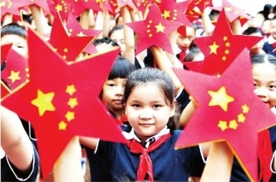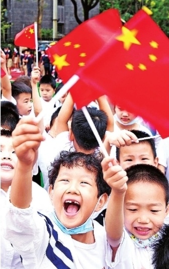低年級的孩子們歡快地揮動小國旗喜迎國慶。