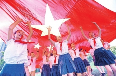 巨幅國旗下,少先隊員們開心地撫摸國旗。