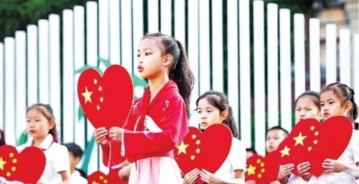 學生們手拿紅心,歌唱祖國。