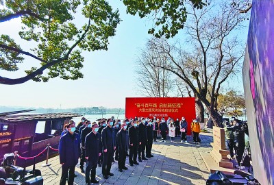 1月18日,中宣部在國家博物館舉行“奮斗百年路?啟航新征程”大型主題采訪活動啟動儀式。圖為浙江新聞宣傳戰線代表在嘉興南湖參加“奮斗百年路?啟航新征程”大型主題采訪活動啟動儀式。新華社記者?孔令杭攝