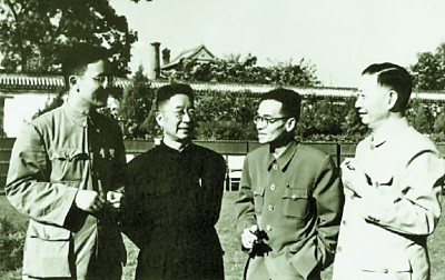 參加一屆全國人大一次會議的華羅庚、老舍、梁思成、梅蘭芳在休息時交談。資料圖片