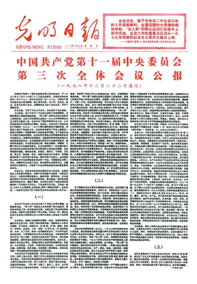 3天后,黨的十一屆三中全會召開。會議宣告:“只有全黨同志和全國人民在馬列主義、毛澤東思想的指導下,解放思想,努力研究新情況新事物新問題,堅持實事求是、一切從實際出發、理論聯系實際的原則,我們黨才能順利地實現工作中心的轉變,才能正確解決實現四個現代化的具體道路、方針、方法和措施,正確改革同生產力迅速發展不相適應的生產關系和上層建筑。”