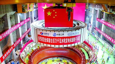 白鶴灘水電站首臺百萬千瓦水輪發電機組轉子吊裝。三峽集團供圖