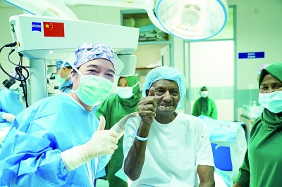 在馬爾代夫首都馬累附近的胡魯馬累醫院,當地一名老人成功接受手術后,豎起大拇指感謝中國眼科醫療隊。新華社發