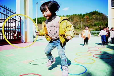 云南省鎮雄縣以古鎮巖洞腳村幼兒園的孩子在操場上玩耍。新華社發