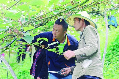 技術人員在貴州省息烽縣石硐鎮大洪村指導農民管護獼猴桃樹。新華社發