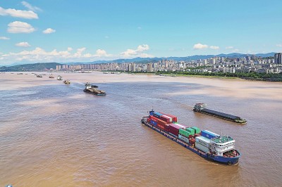 重慶著力推動陸海新通道建設。圖為長江流域豐都段,集裝箱船隊正行駛在江面上。蒲小軍攝/光明圖片