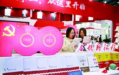 2021年3月31日,2021北京圖書訂貨會在京開幕。訂貨會特設慶祝建黨100周年主題圖書展區,展示各出版單位獻禮建黨百年的優質圖書。新華社發